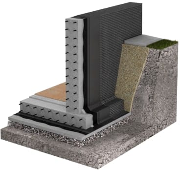 This waterproofing layer consists of three key components, each playing an important role in foundation protection. Two types of waterproofing and one type of drainage protection are used in the wall part of the foundation. Universal bituminous primer No. 1 and Hydroisol Foundation provide reliable waterproofing for the walls. Special attention should be paid to the fact that Hydroisol Foundation has improved adhesive properties compared to the previous version, Hydroisol Osnova. The profiled drainage membrane effectively drains water during rains or in case of plumbing accidents, reliably protecting the main structure from moisture penetration.