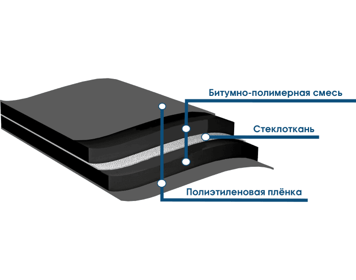 Roofizol CCI is obtained by double-sided application of a bitumen polymer binder consisting of bitumen SBS (styrene-butadiene-styrene), a polymer modifier and a mineral filler (talc chalk, etc.) to a fiberglass base. A polymer film is used as a protective layer (on both sides).