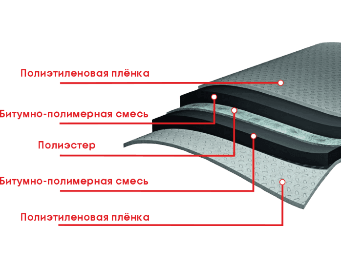Roofizol EPP is obtained by double-sided application of a bitumen polymer binder consisting of bitumen SBS (styrene-butadiene-styrene), a polymer modifier and a mineral filler (talc, chalk, etc.) to a fiberglass base. A polymer film is used as a protective layer (on both sides).
